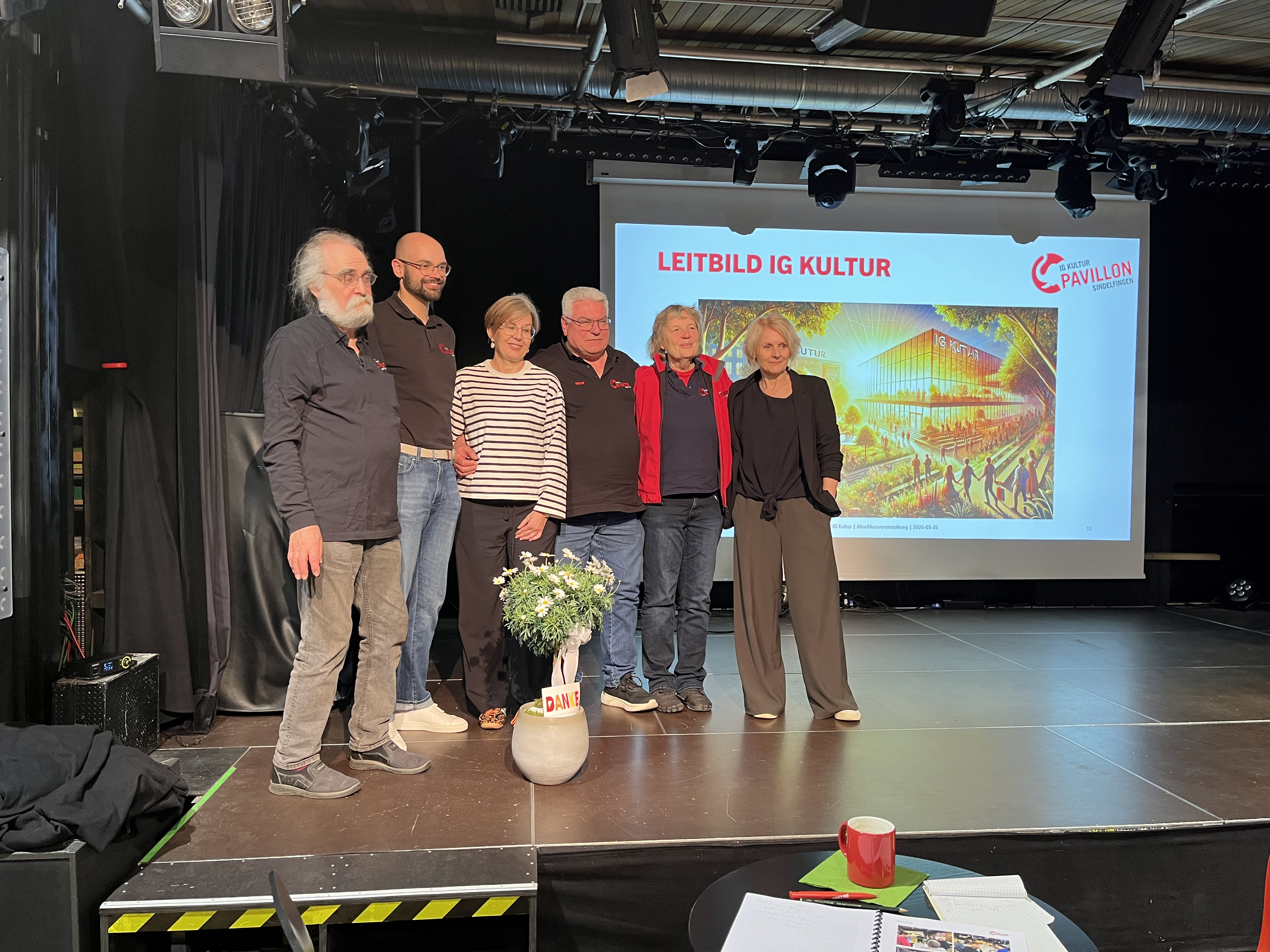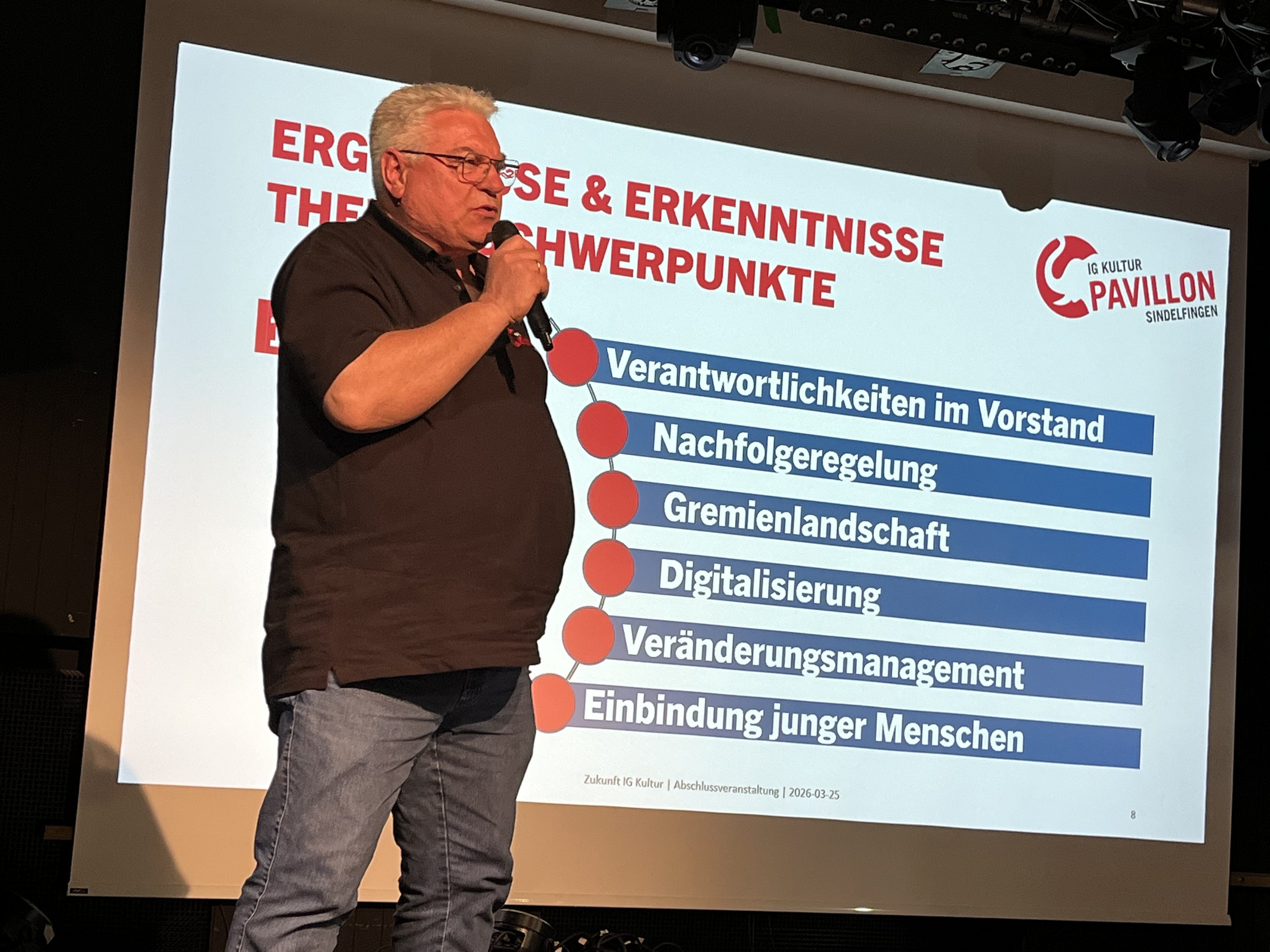 Der Vereinsvorsitzende Thilo Münz stellte gemeinsam mit seinen Mitstreiterinnen und Mitstreitern die Ergebnisse vor. Nachdem in einem Worldcafé im Februar 2025 mit 40 Mitwirkenden aus Verein, Stadtgesellschaft und Verwaltung die Ziele identifiziert und das Vorgehen festgelegt wurde, bildeten sich vier Arbeitsgruppen: Zielgruppenentwicklung/Kooperationen, Vielfalt, Sichtbarkeit und Räumlichkeiten. In diesen Arbeitsgruppen wurden dann die einzelnen Arbeitsschritte entwickelt. Wie kann es gelingen, neue Mitglieder für den Vorstand zu gewinnen, neues Publikum zu erreichen und ans Haus zu binden aber auch in der Stadt Sindelfingen und darüber hinaus sichtbarer zu werden?