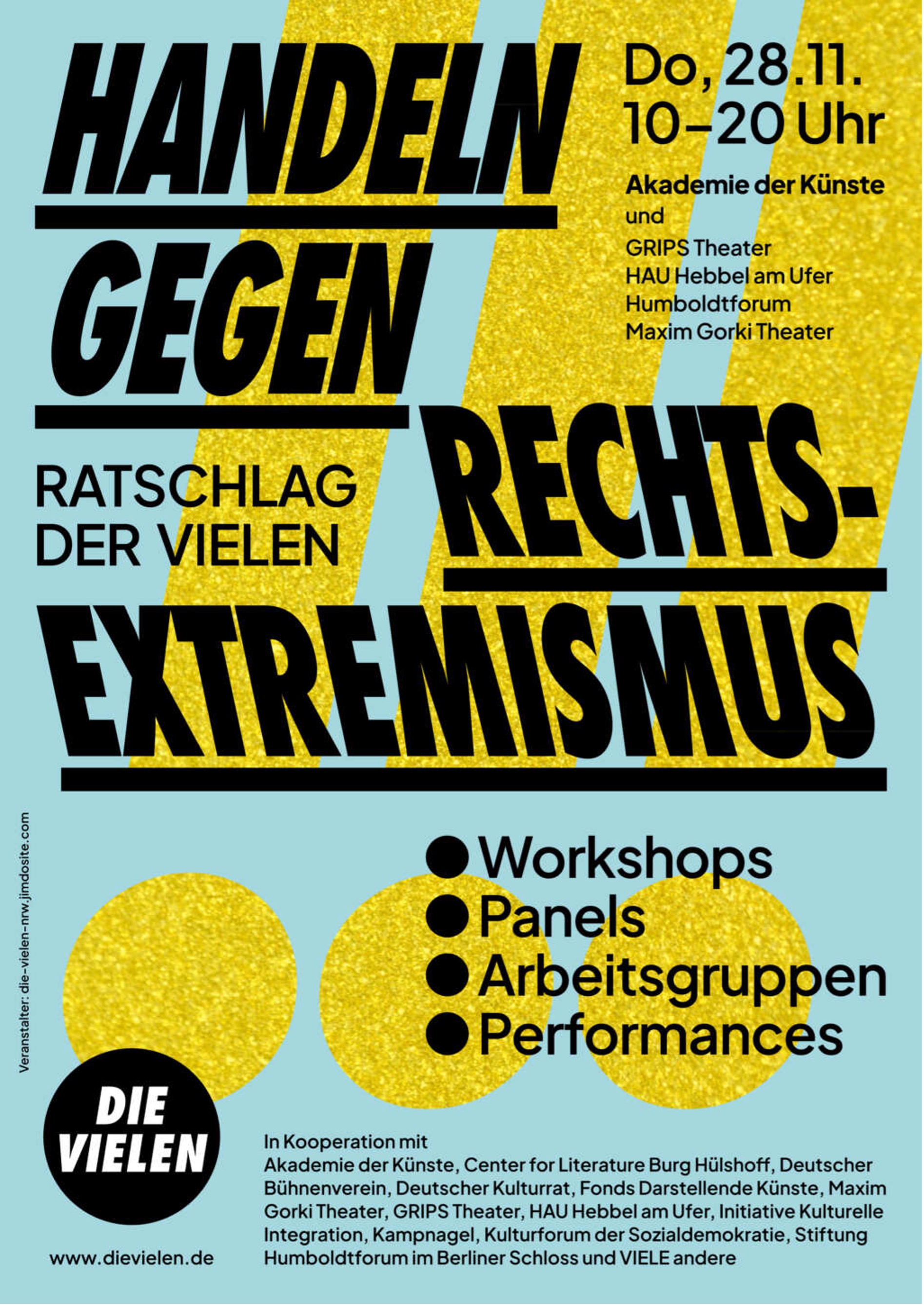 Ratschlag der Vielen: Am 28. November 2024 in Berlin war das Thema ganz konkret „Handeln gegen Rechtsextremismus“. Bereits im Herbst 2023 startete auf Kampnagel in Hamburg die aktuelle Kampagne, deren vorläufiger Höhepunkt die bundesweite Aktionswoche gegen die Normalisierung von rechtsextremer Politik von 26.08. bis 02.09.2024 war. Die LAKS Baden-Württemberg gehörte zu den Erstunterzeichnenden der Erklärung SHIELD & SHINE – WIR SIND VIELE.