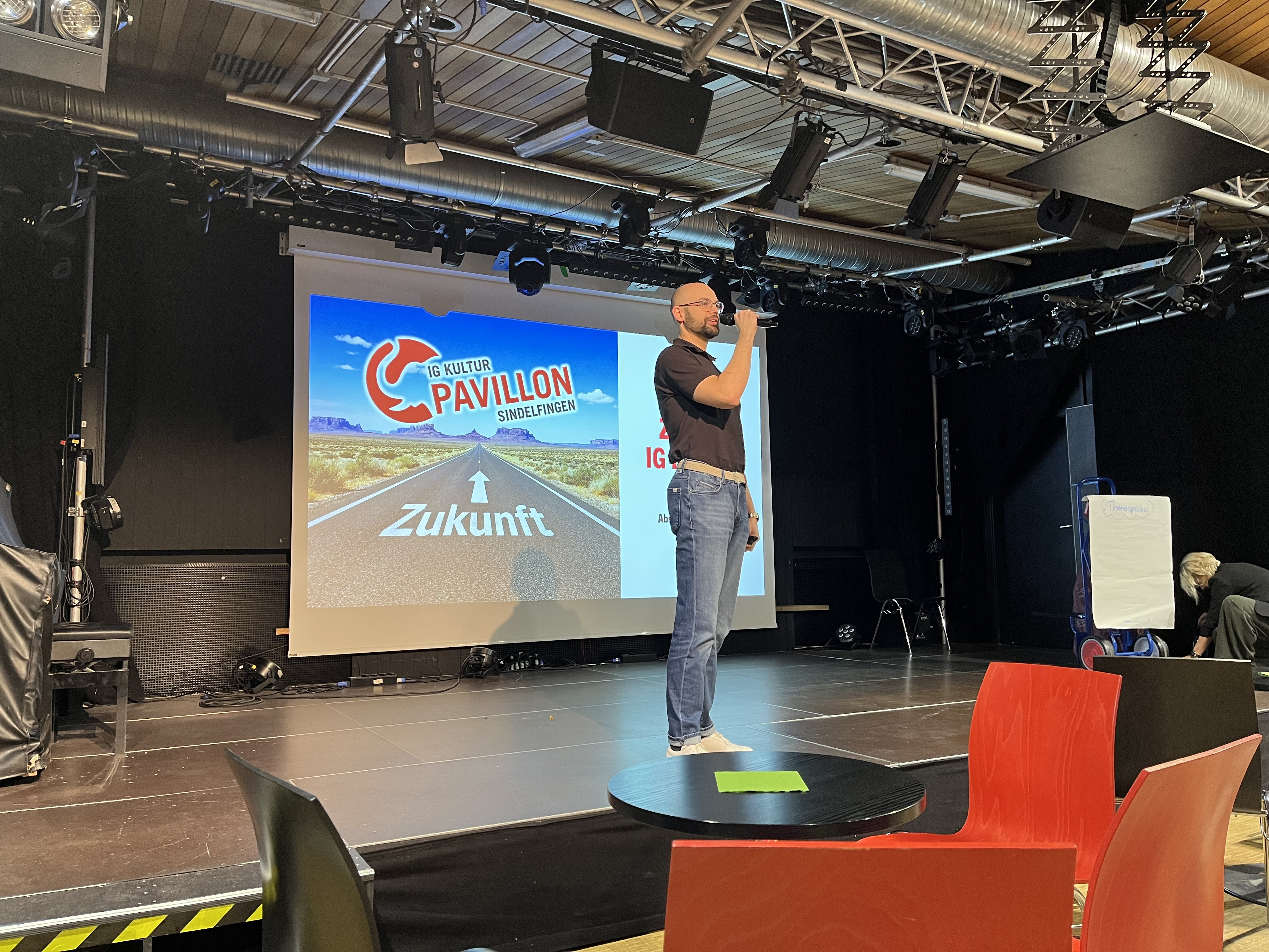Der Vereinsvorsitzende Thilo Münz stellte gemeinsam mit seinen Mitstreiterinnen und Mitstreitern die Ergebnisse vor. Nachdem in einem Worldcafé im Februar 2025 mit 40 Mitwirkenden aus Verein, Stadtgesellschaft und Verwaltung die Ziele identifiziert und das Vorgehen festgelegt wurde, bildeten sich vier Arbeitsgruppen: Zielgruppenentwicklung/Kooperationen, Vielfalt, Sichtbarkeit und Räumlichkeiten. In diesen Arbeitsgruppen wurden dann die einzelnen Arbeitsschritte entwickelt. Wie kann es gelingen, neue Mitglieder für den Vorstand zu gewinnen, neues Publikum zu erreichen und ans Haus zu binden aber auch in der Stadt Sindelfingen und darüber hinaus sichtbarer zu werden?