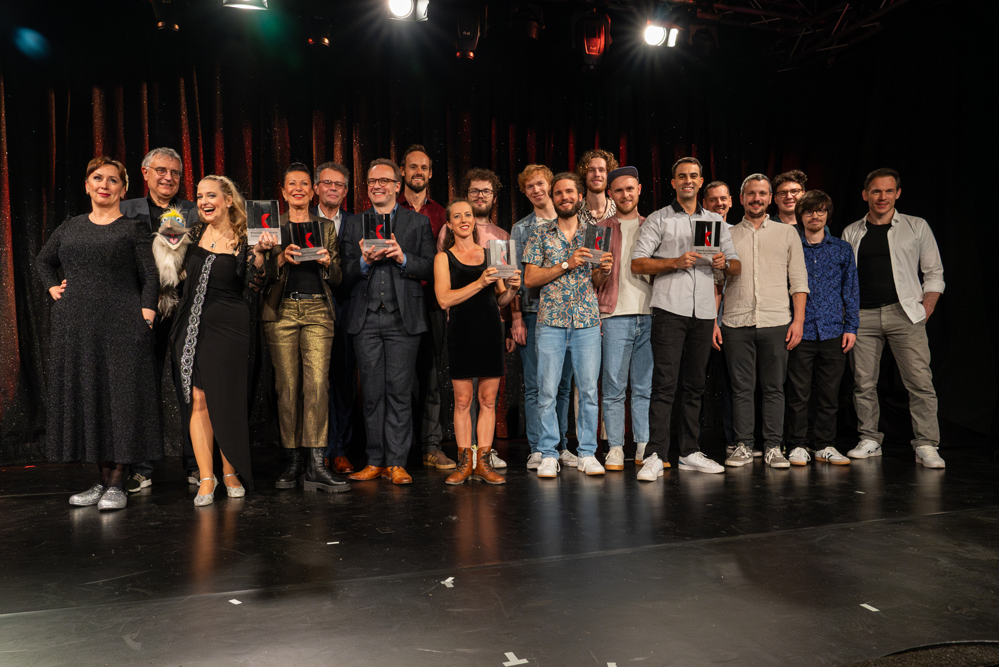Mit ganz viel Herzblut präsentierten die Künstlerinnen und Künstler bei der Preisverleihung im Kulturzentrum franz. K in Reutlingen ein buntes Kleinkunst-Potpourri. „Die im doppelten Wortsinn ausgezeichnete Kleinkunst aus The LÄND sprengt mal wieder alle Genre-Schubladen, also nennen wir sie lieber ,Groß-Kunst‘", so Staatssekretär Arne Braun anlässlich der Verleihung. „Politiker-Kabarett, zeitgenössischer Zirkus, Mundart-Pop, A-cappella-Pop-Boygroup, Hochleistungsbauchreden, Unsinn und Spaß… mehr Vielfalt geht kaum – und alles in höchster Qualität. Von der humoristischen Sahnetorte Baden-Württembergs durften wir in Reutlingen die Kirschen picken. Ganz großes Kino!“